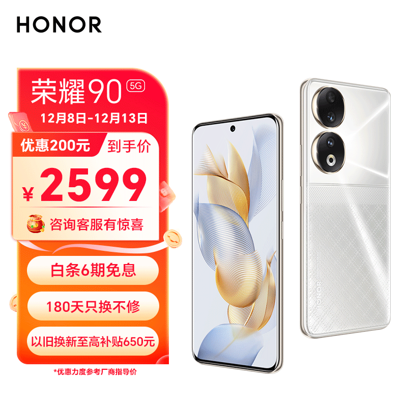 荣耀90 2亿像素超清相机 零风险调光护眼屏 5000mAh轻薄长续航 16GB+256GB 星钻银 5G价格:2499.00元!
