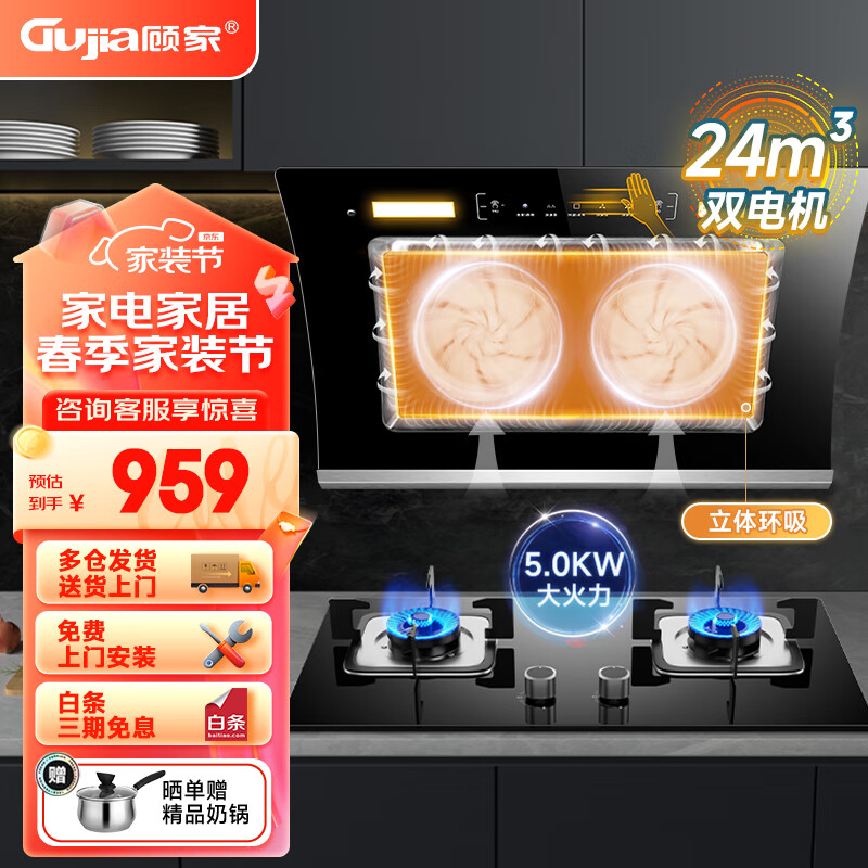 顾家(Gujia)抽油烟机灶具套装24立方大吸力侧吸式家用油烟机5.0KW燃气灶两件套(液化气)价格:1259.00元!