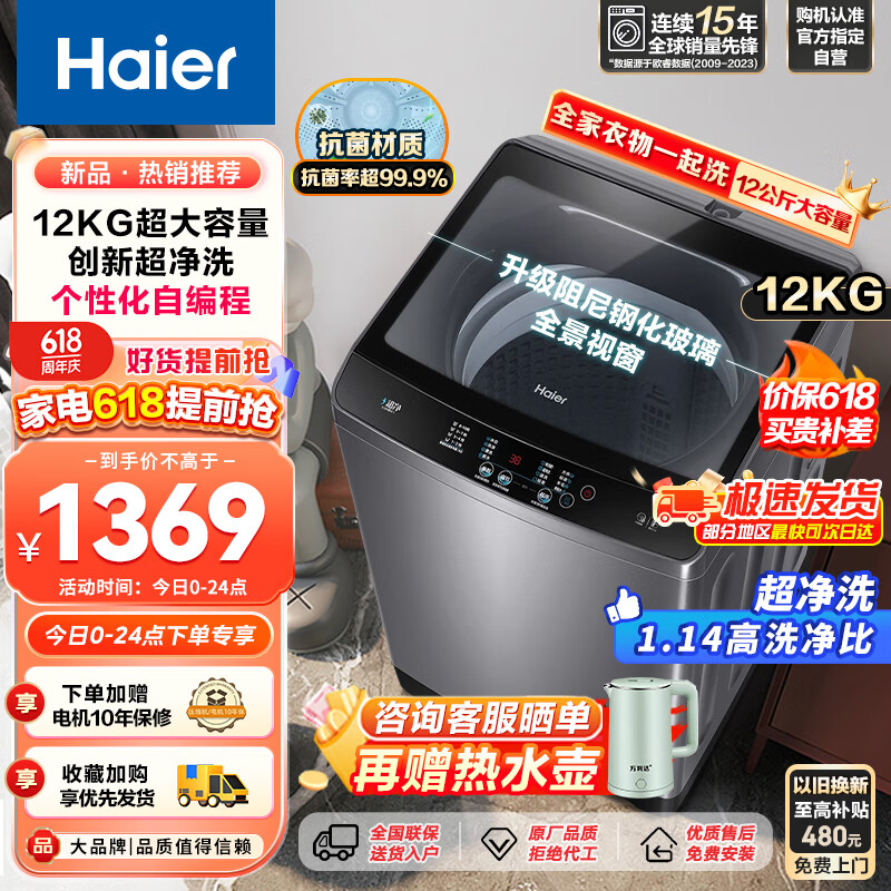 海尔(Haier)全自动波轮洗衣机 12公斤 超净系列 全自动家用大容量自编程漂甩合一桶自洁羊毛洗 以旧换新 Z216价格:1369.00元!