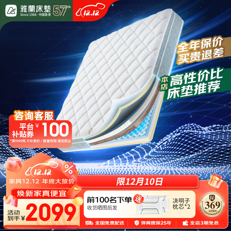1、雅兰国民家居AIR透气面料进口乳胶独袋弹簧椰棕床垫琉璃1.5米*2米。这款床垫两面可用,一面乳胶睡感适中,一面椰棕,睡感偏硬,新房装修还没入住,相信国货质量肯定不错,价格实惠!