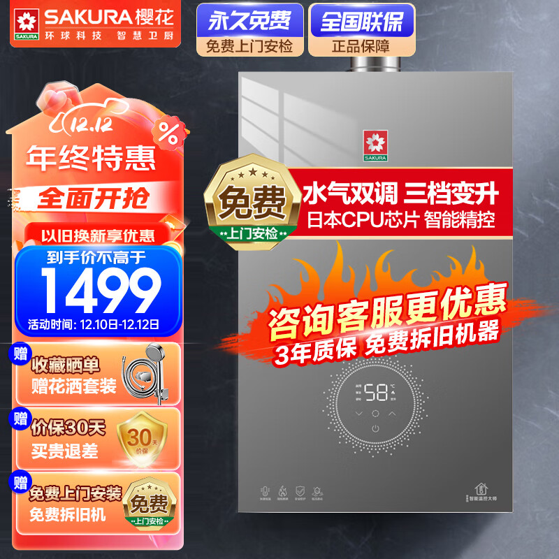 樱花(SAKURA)16升燃气热水器天然气水气双调恒温日本CPU精准控温变频降噪低水压启动三档变升JSQ30-JJB010价格:1699.00元!