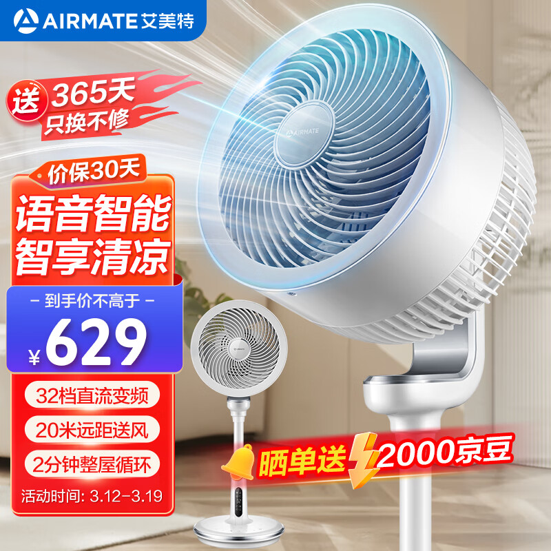 艾美特(AIRMATE)“24年天鹅语音款”空气循环扇等离子净化除菌32档直流变频落地扇3D自动摇头电风扇 FA23-SRD83价格:679.00元!