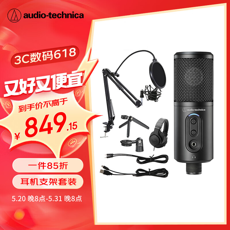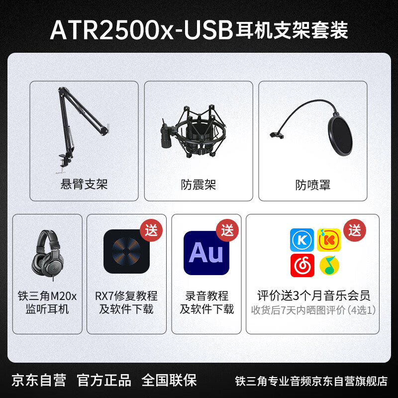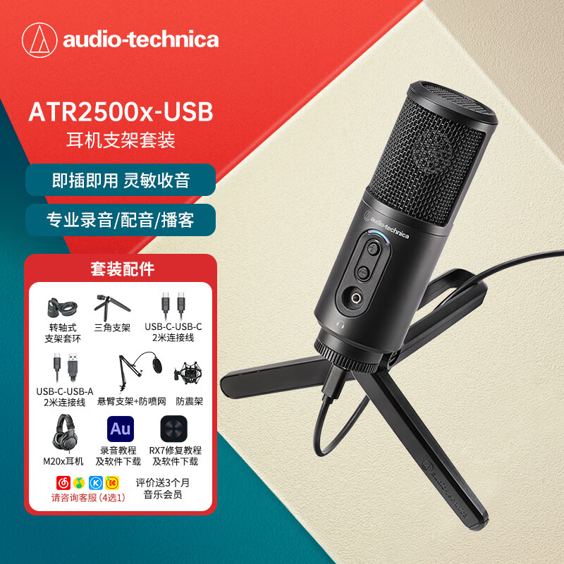 铁三角ATR2500X-USB 指向性电容USB麦克风电脑轻松连接直播K歌录音配音专用话筒支架套装 配耳机M20X价格:999.00元!