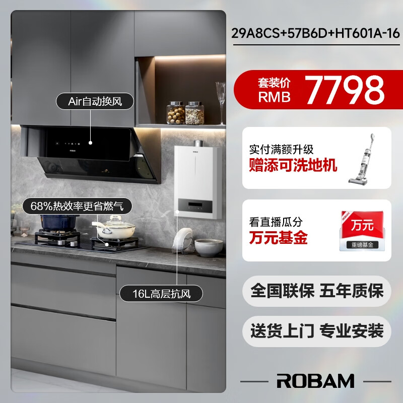 老板(Robam)抽油烟机探索家A8CS变频聪明25m3/min灶具热水器烟灶热厨房多件套29A8CS+57B6DT+HT601A-16价格:7798.00元!