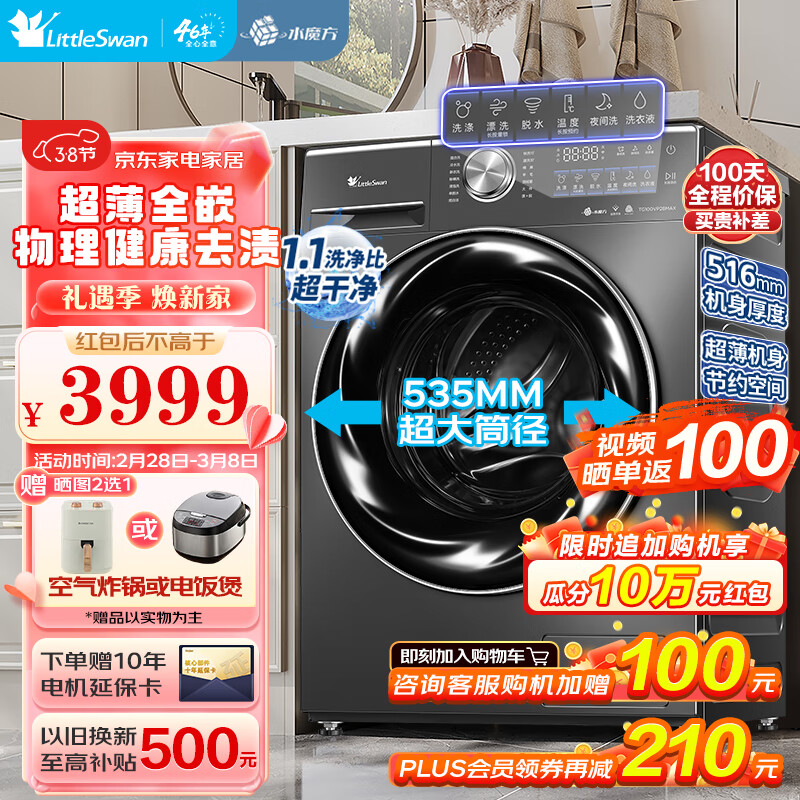 小天鹅(LittleSwan)滚筒洗衣机全自动 10公斤大容量家用 水魔方超微净泡 智能投放 超薄全嵌 小钢炮2.0 TG100VP28MAX价格:4099.00元!