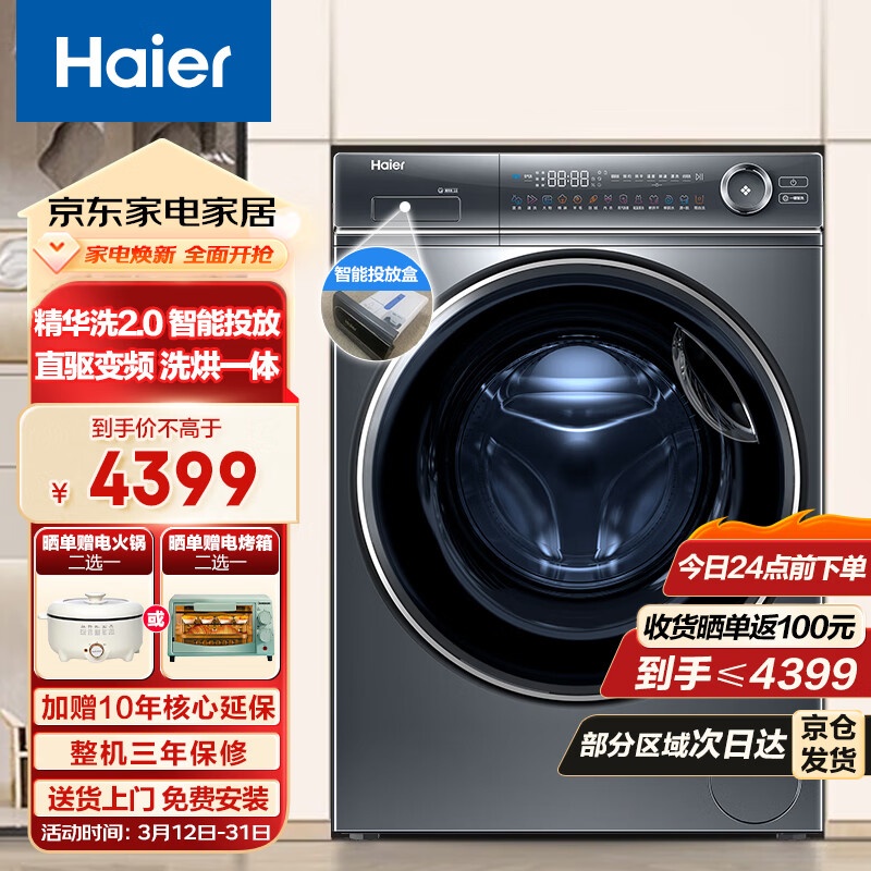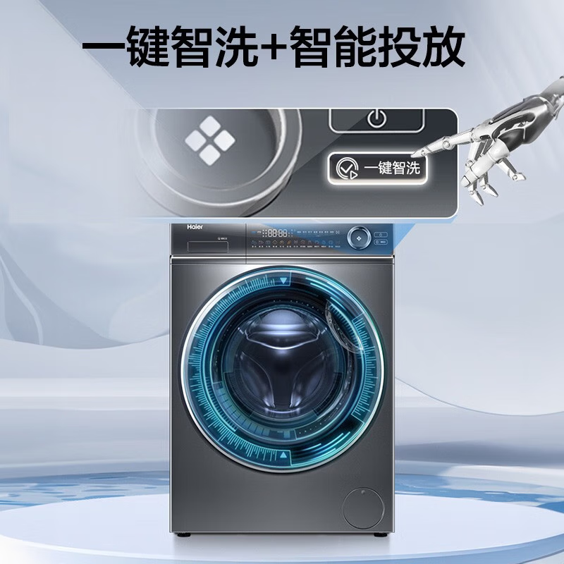海尔(Haier)【升级精华洗】10KG全自动滚筒洗衣机家用直驱一级能效智能投放空气洗除菌螨+洗烘一体EG100HBD66S价格:4499.00元!