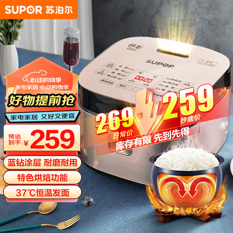 苏泊尔(SUPOR)电饭煲家用5-8个人电饭锅4L蓝钻球釜内胆特色烘焙发面功能多功能智能电饭煲40FC873新老品随机发货价格:259.00元!