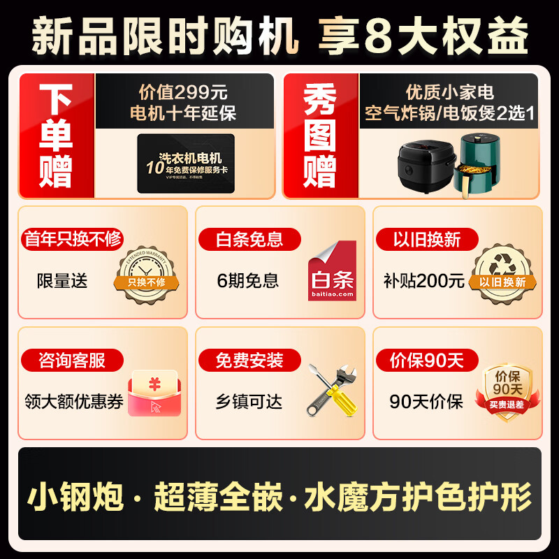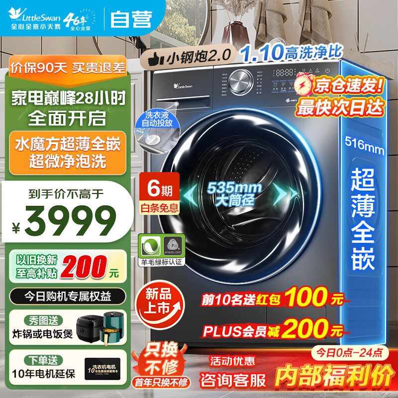 小天鹅(LittleSwan)洗衣机全自动家用10公斤【小钢炮2.0】 水魔方超薄全嵌滚筒洗衣机单洗 一级能效 以旧换新VP28价格:3999.00元!