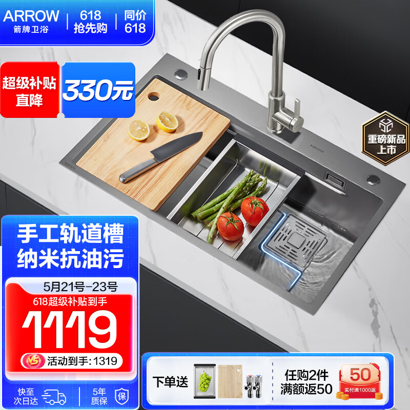 箭牌(ARROW)304不锈钢水槽手工纳米轨道大单槽厨房洗菜盆洗菜池洗碗一体盆 70灰手工纳米轨道槽-含抽拉龙头价格:1551.00元!