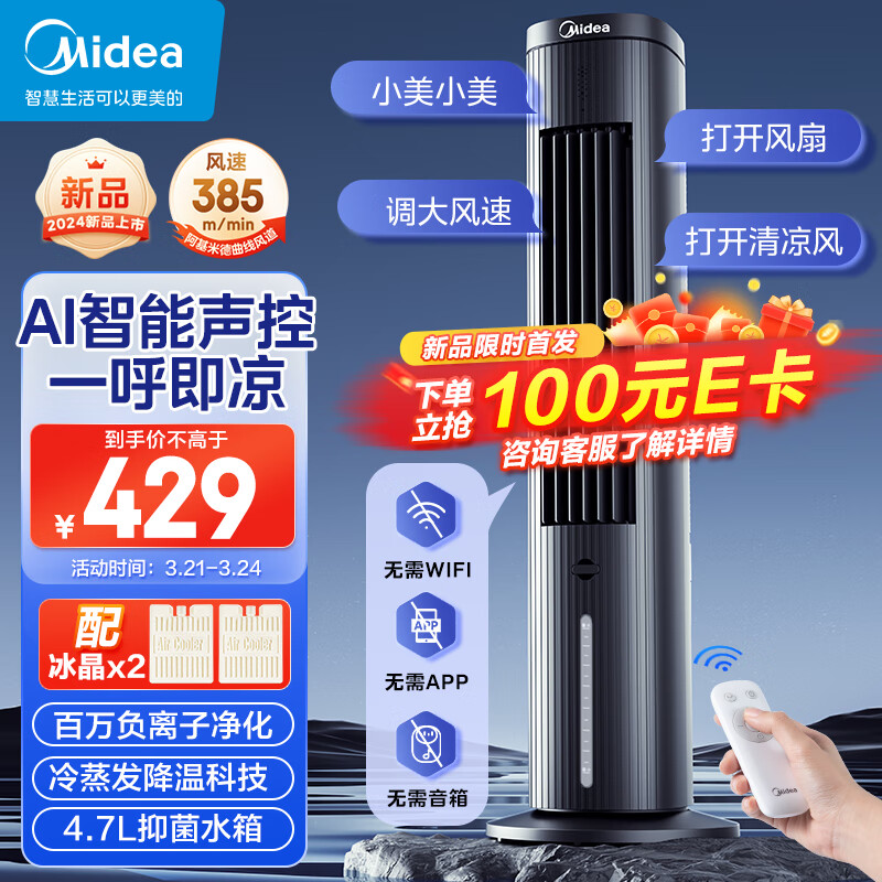 美的(Midea)【强劲制冷】智能语音遥控家用冷风扇/负离子净化落地空调扇/冷风机/水冷塔扇/制冷小空调ACA10TJR价格:519.00元!