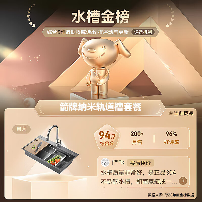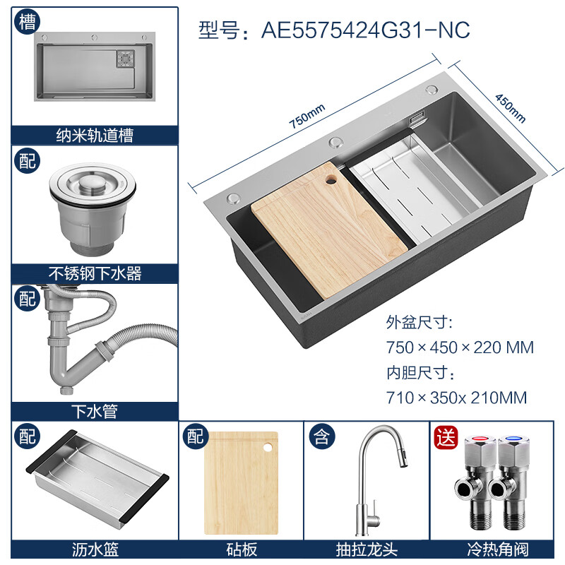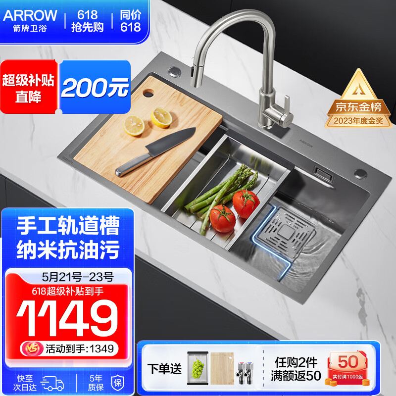 箭牌(ARROW)304不锈钢水槽手工纳米轨道大单槽厨房洗菜盆洗菜池洗碗一体盆 75灰手工纳米轨道槽-含抽拉龙头价格:1469.00元!