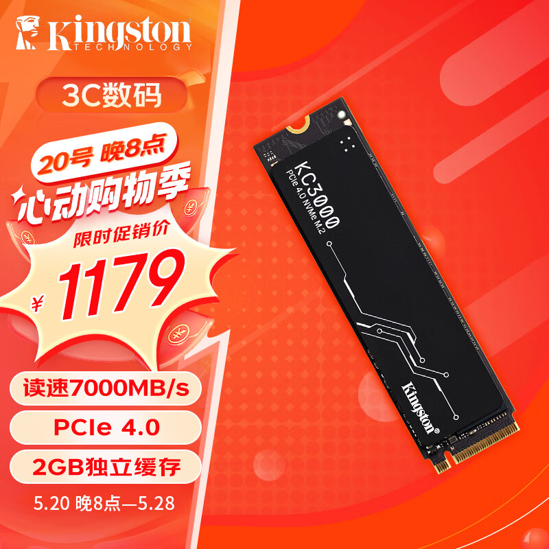 金士顿(Kingston) 2TB SSD固态硬盘 M.2接口(NVMe PCIe 4.0×4) KC3000 读速高达7000MB/s AI 电脑配件价格:1179.00元!