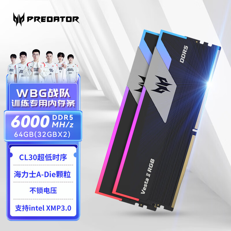宏碁掠夺者(PREDATOR)64G(32G×2)套装 DDR5 6000频率 台式机内存条 Vesta II 炫光星舰RGB灯条(C30) 石耀黑 AI电脑配件价格:1349.00元!