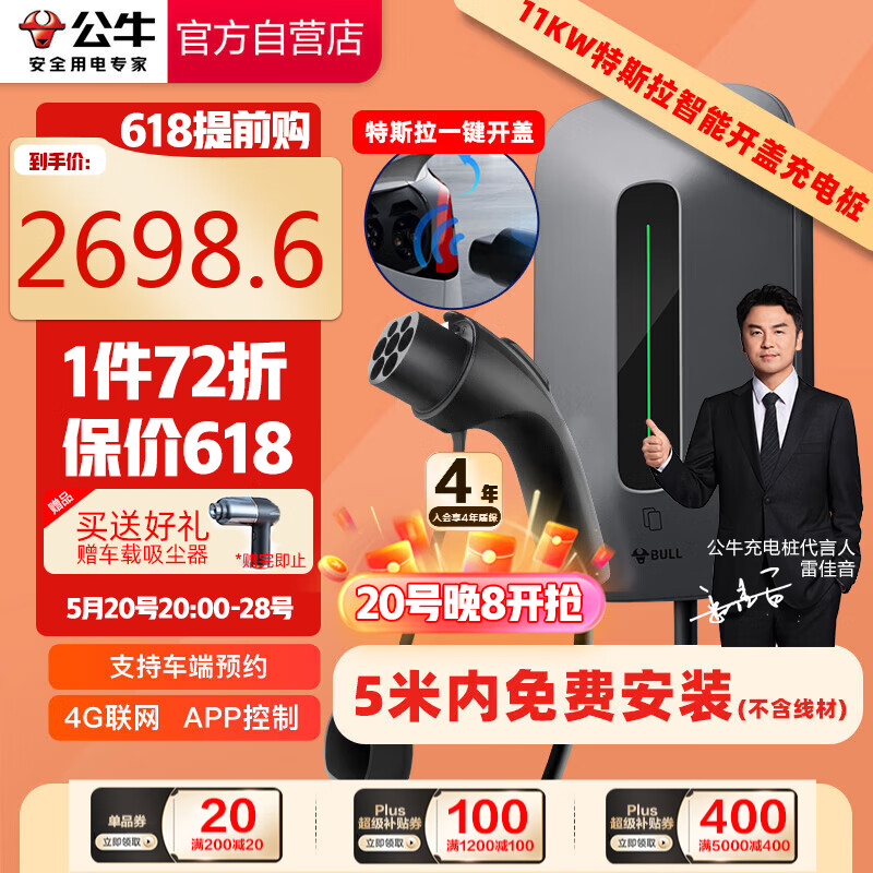 公牛(BULL)新能源汽车交流充电桩适配于特斯拉全系小米su7汽车等 11KW4G款 送基础安装价格:3749.00元!