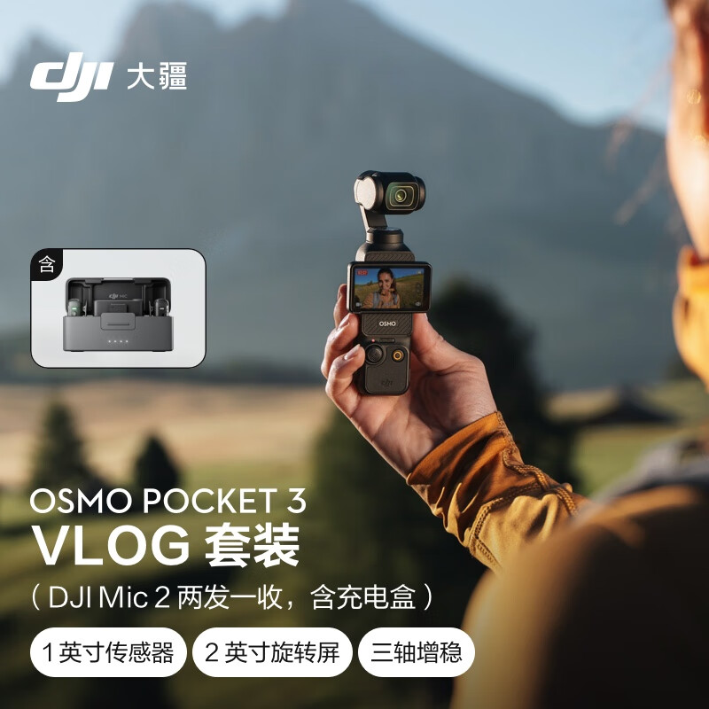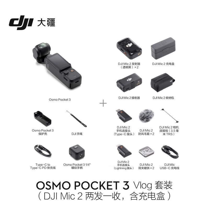 大疆DJI Osmo Pocket 3 vlog 套装(DJI Mic 2 两发一收,含充电盒)一英寸口袋云台相机价格:5998.00元!