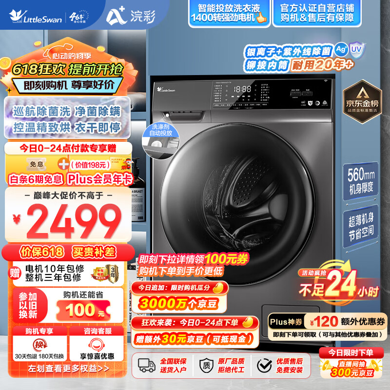 小天鹅(LittleSwan)滚筒洗衣机全自动 浣彩系列 洗烘一体 智能投放 超薄10公斤 TD100VT616WIADY-T1B价格:2599.00元!