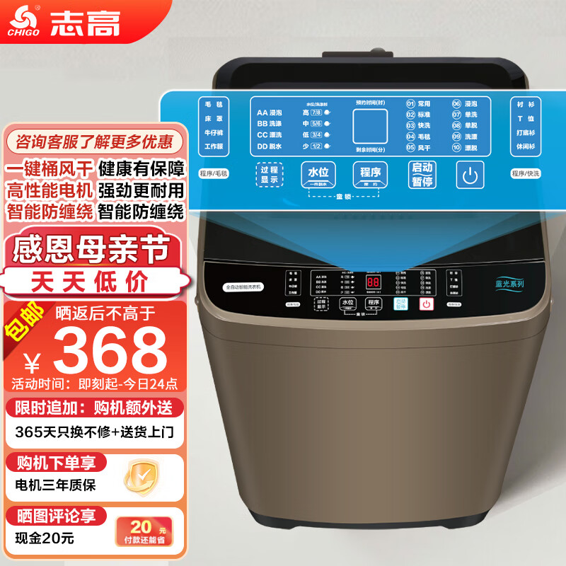 志高(CHIGO)洗衣机小型家用全自动波轮洗衣机5.5公斤 智能洗脱一体机 蓝光洗护强劲电机仿生手洗 金色价格:388.00元!