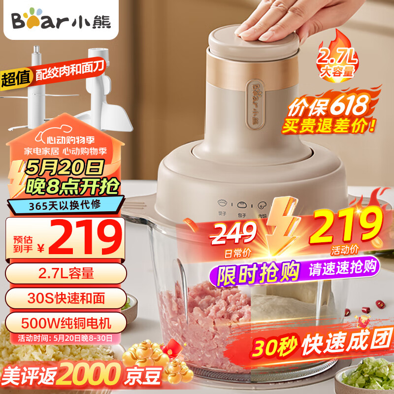 小熊(Bear)绞肉机家用 和面机 多功能揉面搅面绞馅机 打肉饺子肉馅碎肉机 搅肉机2.7L大容量 QSJ-P05A5价格:219.00元!