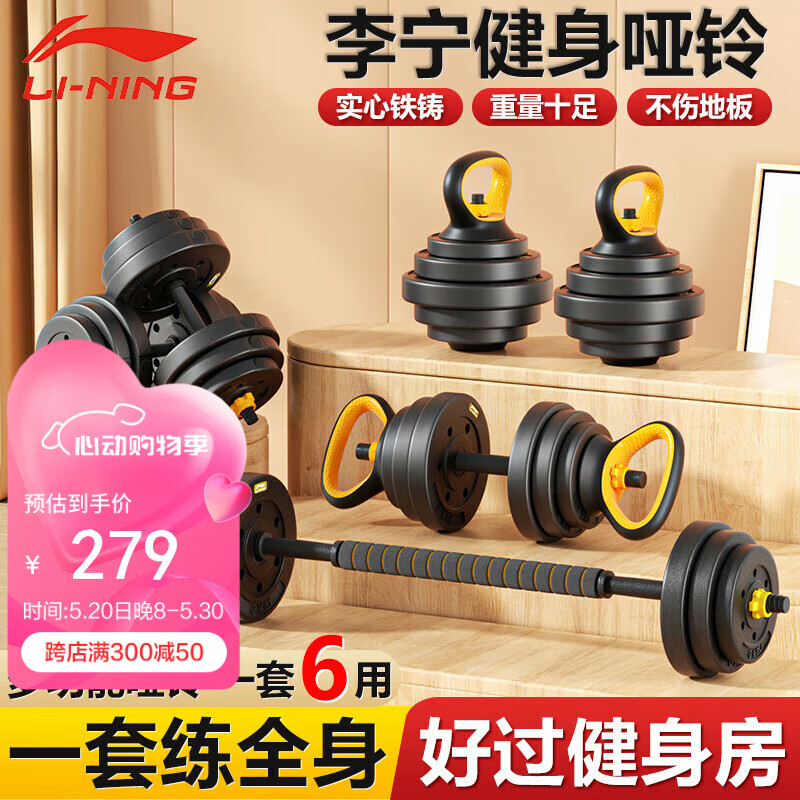 李宁(LI-NING)哑铃男女健身杠铃可调节拆卸家用运动环保器材壶铃组合训练全套装价格:279.00元!