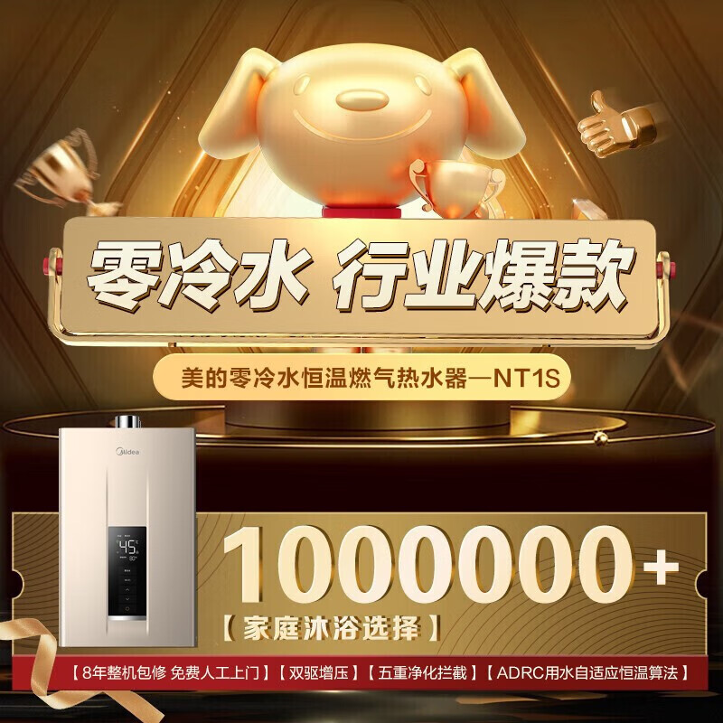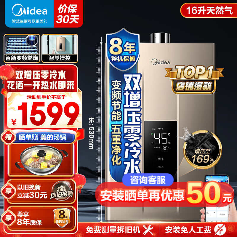 美的(Midea)零冷水燃气热水器天然气 家用即热水气双调双增压零冷水强排变频恒温省气25%智能家电NT1S系列 16升零冷水NT1S(一厨两卫) 天然气价格:1899.00元!