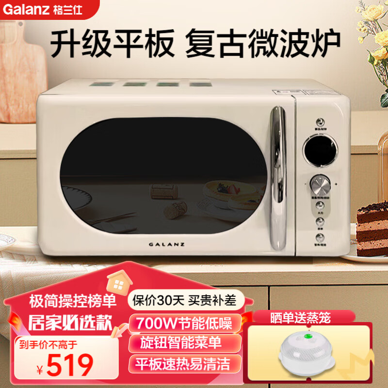 格兰仕(Galanz)复古微波炉 小型迷你 家用20L简单旋钮操控 易清洁大平板 加热速度快 智能自动菜单 EL 复古白价格:599.00元!