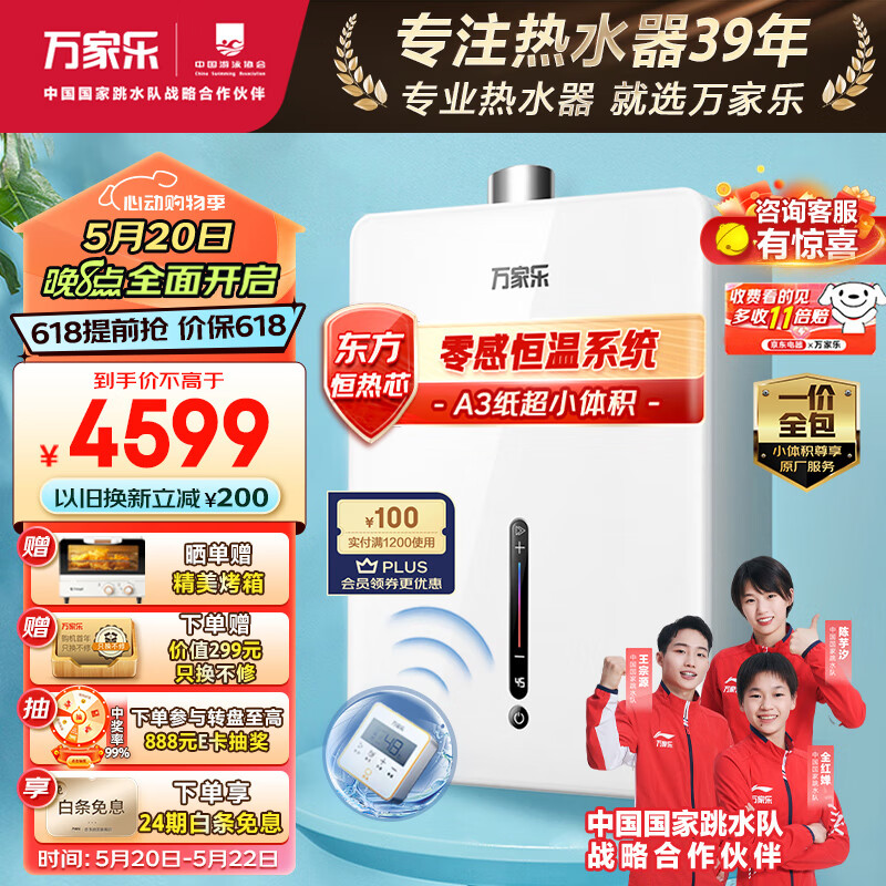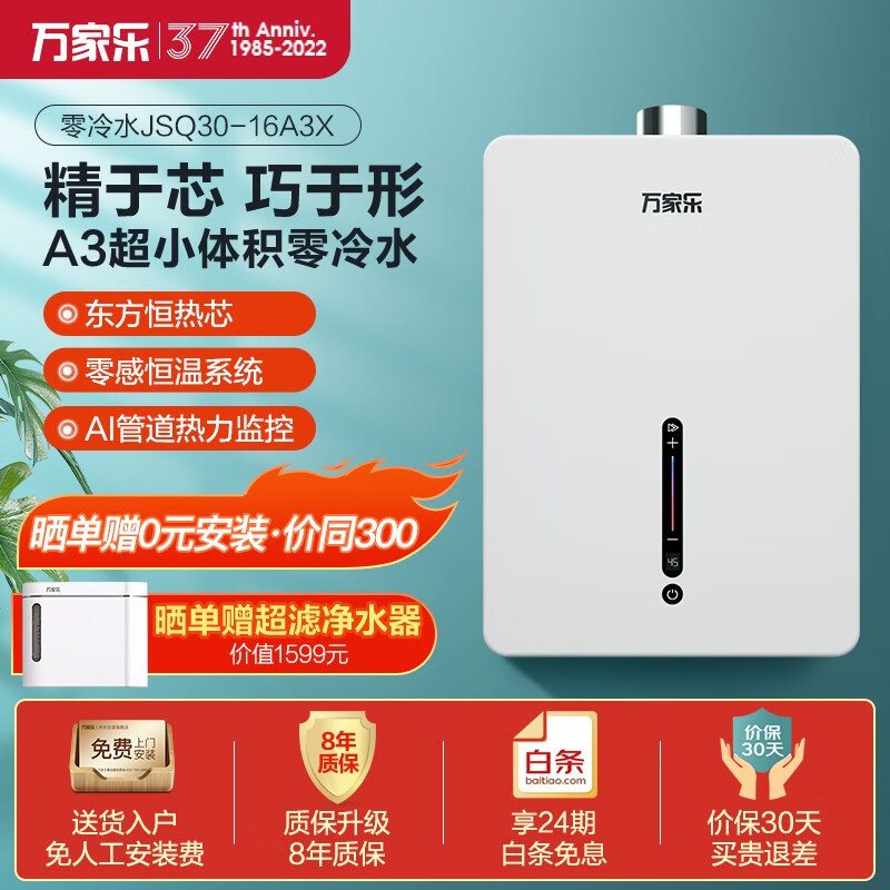 万家乐 16升A3纸超小体积东方恒热芯省气零冷水零感恒温系统三重操控五重杀菌增压燃气热水器JSQ30-16A3X价格:6598.00元!