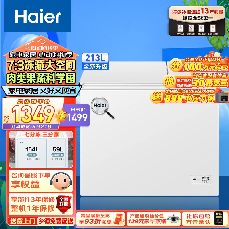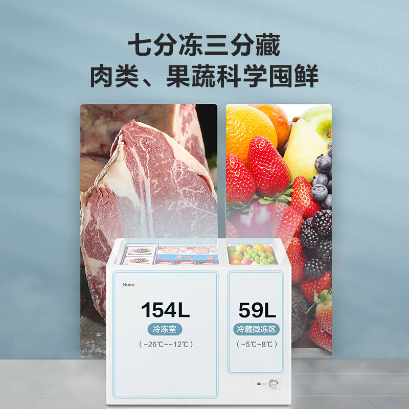 海尔(Haier)213升双箱双温商用家用冰柜 大冷冻小冷藏卧式冰柜家用小型冰箱冷柜FCD-213GHXZ 以旧换新价格:1449.00元!