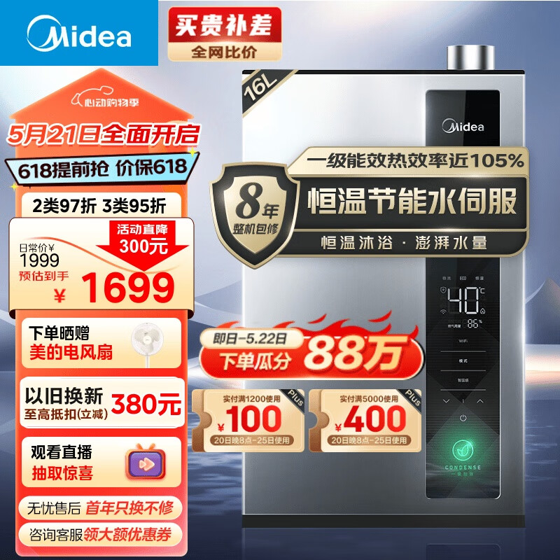 美的(Midea)16升燃气热水器 天然气 超一级能效 智控水伺服 家用省气 恒温节能 JSLQ27-16LN1影墨 以旧换新价格:1899.00元!