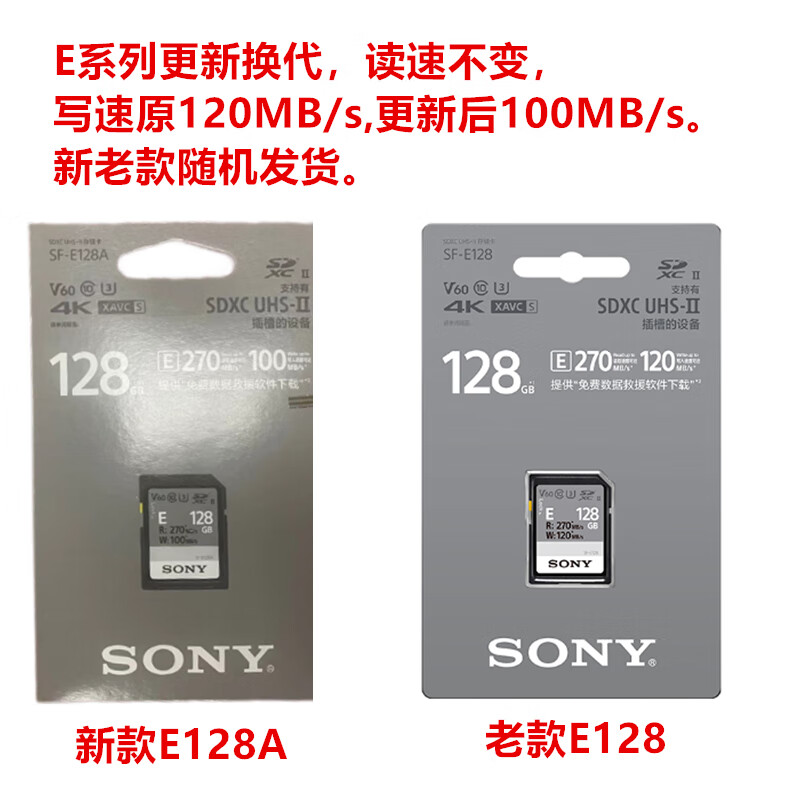 索尼(SONY)128GB SD存储卡 SF-E128A E系列U3 V60读速270MB/s IP57防护等级相机内存卡(新老款随机发货)价格:539.00元!