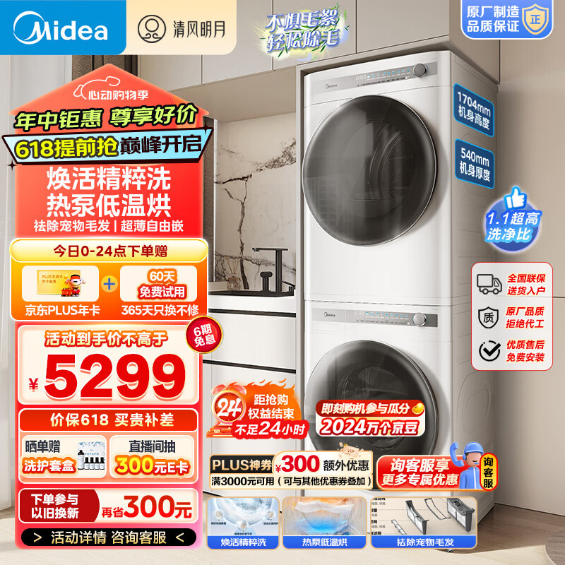 美的(Midea)洗烘套装 10公斤滚筒洗衣机全自动+热泵烘干机 焕活精粹洗 超薄【云朵系列】MG100AIR1+AIR1价格:5299.00元!