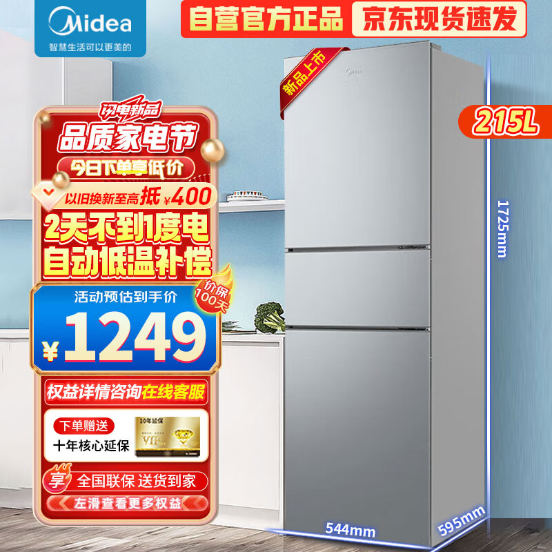 美的(Midea)【线下同款】215升三门三温三开门小冰箱小户型大容量租房家用宿舍节能保鲜省电低音BCD-215TM价格:1249.00元!