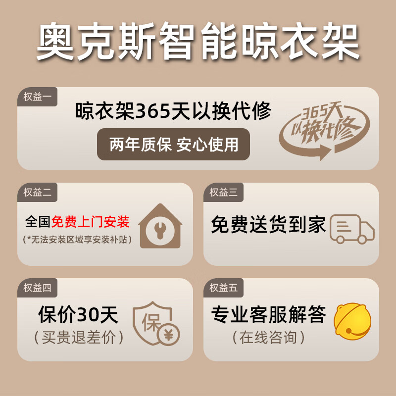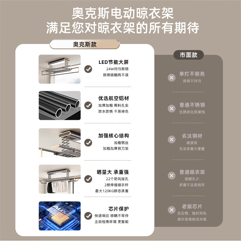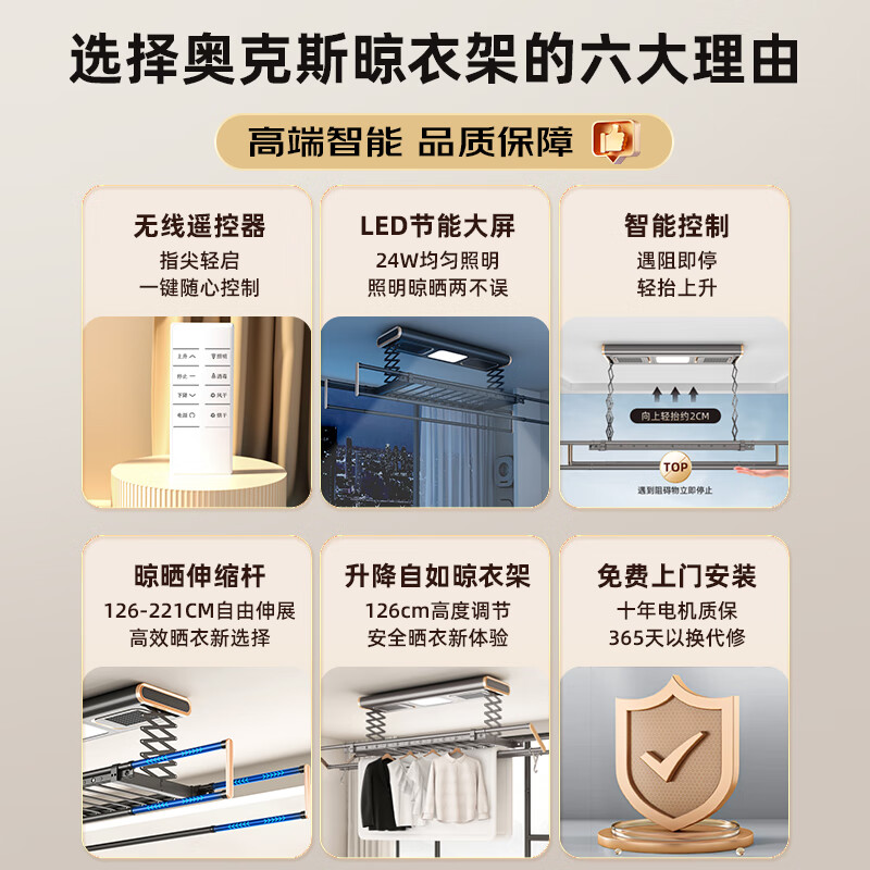 奥克斯(AUX)电动晾衣架升级款自动升降杆阳台室外四杆伸缩遥控LED照明灰EH802价格:779.00元!