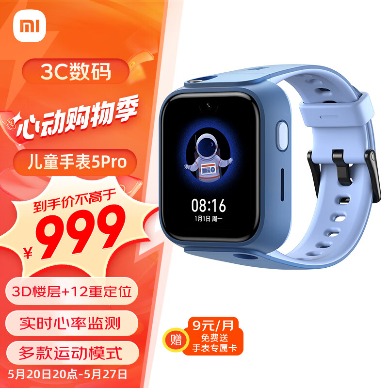 小米(MI)米兔儿童电话学习手表5Pro 心率监测4G通 双摄GPS定位防水 男女孩学生儿童智能手表 灰普蓝色价格:999.00元!