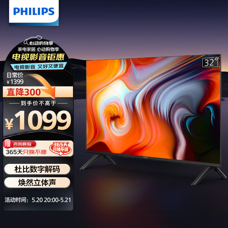 飞利浦(PHILIPS)32英寸全高清智慧屏老年人家用小屏 无线投屏教育智能平板液晶电视机 32PFF6899/T3以旧换新价格:1099.00元!