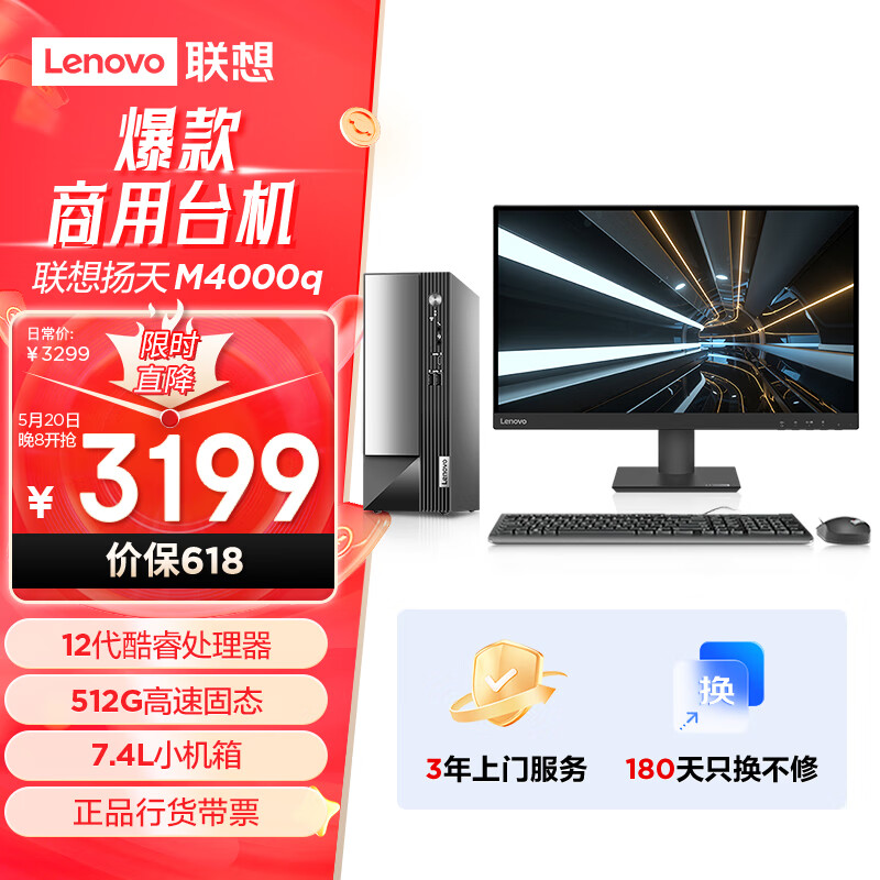 联想(Lenovo)扬天M4000q 商用办公台式电脑主机(酷睿12代i3-12100 8G 512G SSD)27英寸价格:3199.00元!