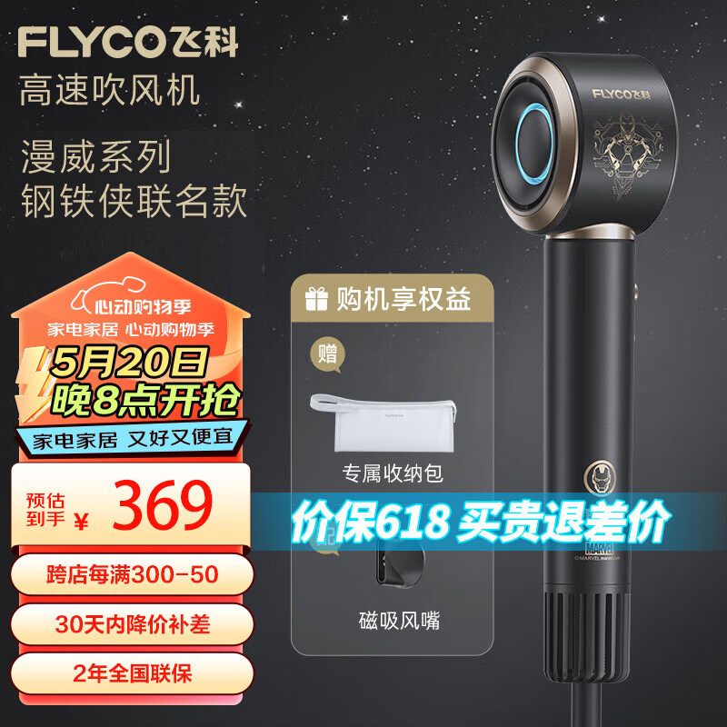 飞科(FLYCO)高速电吹风机家用宿舍用负离子护发便携大功率速干送女友节日礼物钢铁侠联名高速吹风筒FH6372价格:449.00元!