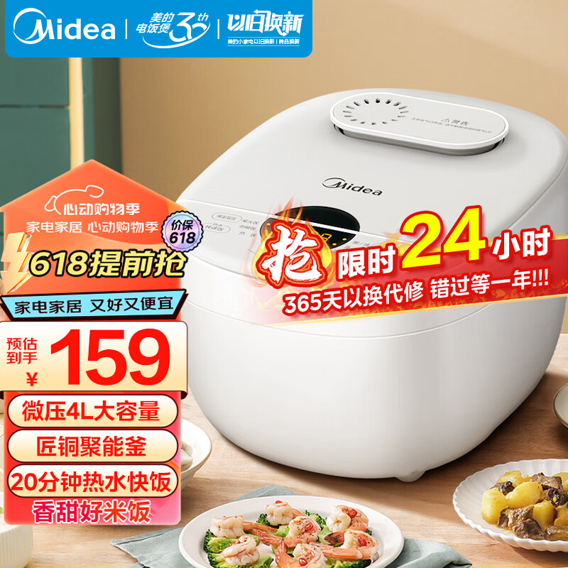 美的(Midea)智能电饭煲电饭锅家用4L预约匠铜聚能釜内胆快速饭蒸煮米饭锅FB40E108(3-8人)价格:159.00元!