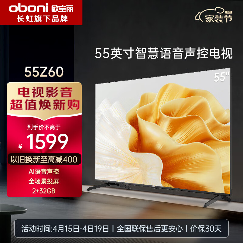 长虹欧宝丽55Z60 55英寸4K超高清智慧语音声控全景屏2+32GB智能平板液晶电视机 55英寸价格:1599.00元!