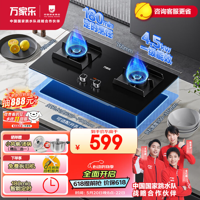 万家乐燃气灶4.5kW火力 家用嵌入式台式两用煤气灶 智能单边定时灶 全进风灶具JZY-KV062B液化气价格:699.00元!