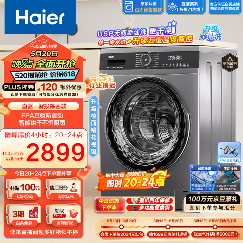 海尔(Haier)滚筒洗衣机全自动 洗烘一体机 10公斤大容量【直驱旗舰EG100HMATE71S】一级能效 以旧换新 带烘干价格:2899.00元!