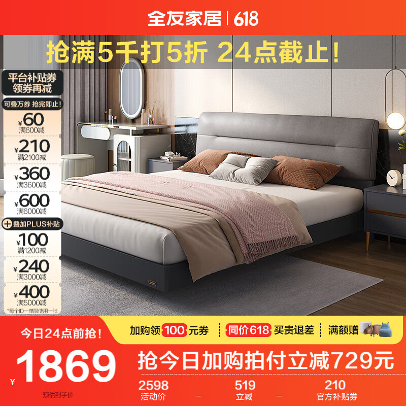 全友家居 主卧室轻奢软包床头板式床悬浮床1.8x2米双人大床家具126805价格:2598.75元!