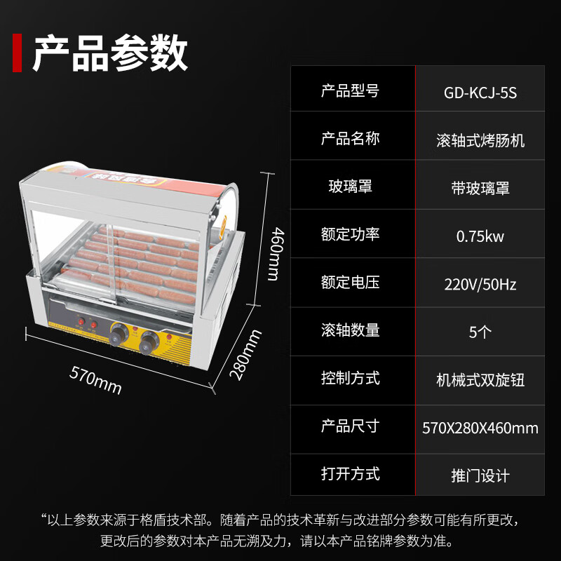 格盾(gedun)烤肠机商用热狗机小吃店全自动台式烤火腿肠机 5管单控(带左右推门)GD-KCJ-5S价格:438.00元!