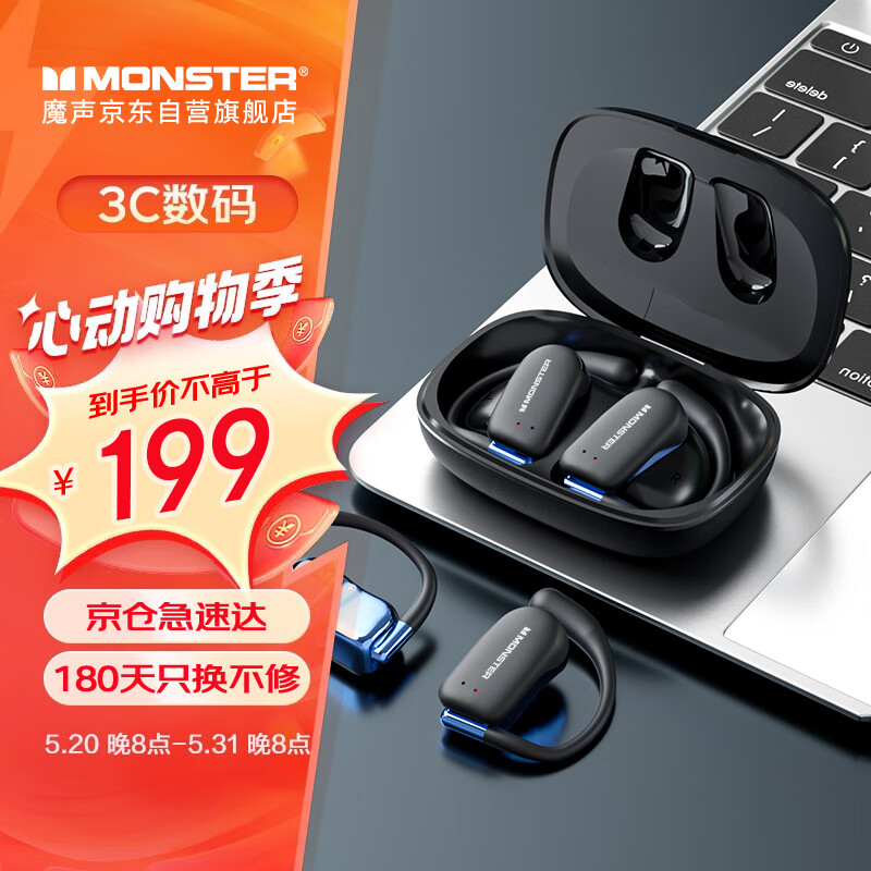 魔声(MONSTER)XKO07挂耳式蓝牙耳机不入耳智能降噪跑步运动耳机适用于华为苹果小米无线耳机 黑色价格:239.00元!