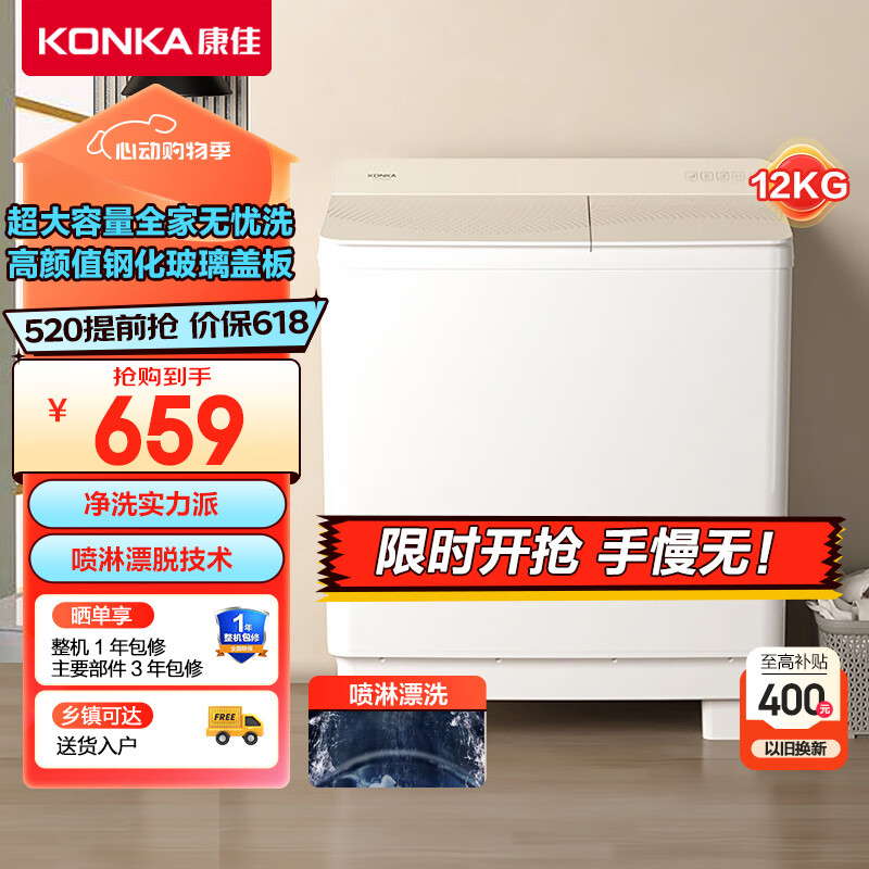康佳(KONKA)12公斤半自动洗衣机家用老式双桶双缸大容量脱水甩干机钢化玻璃盖板品质双电机XPB120-339S价格:658.00元!