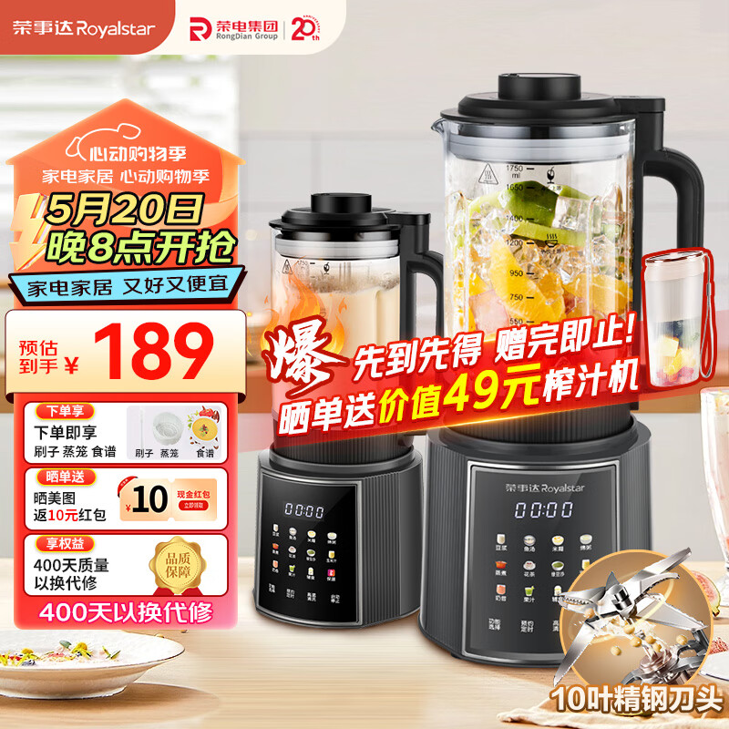 荣事达(Royalstar)破壁机家用豆浆机料理机榨汁机搅拌果汁机多功能预约定时婴儿免滤辅食机RZ-328H(D)价格:189.00元!