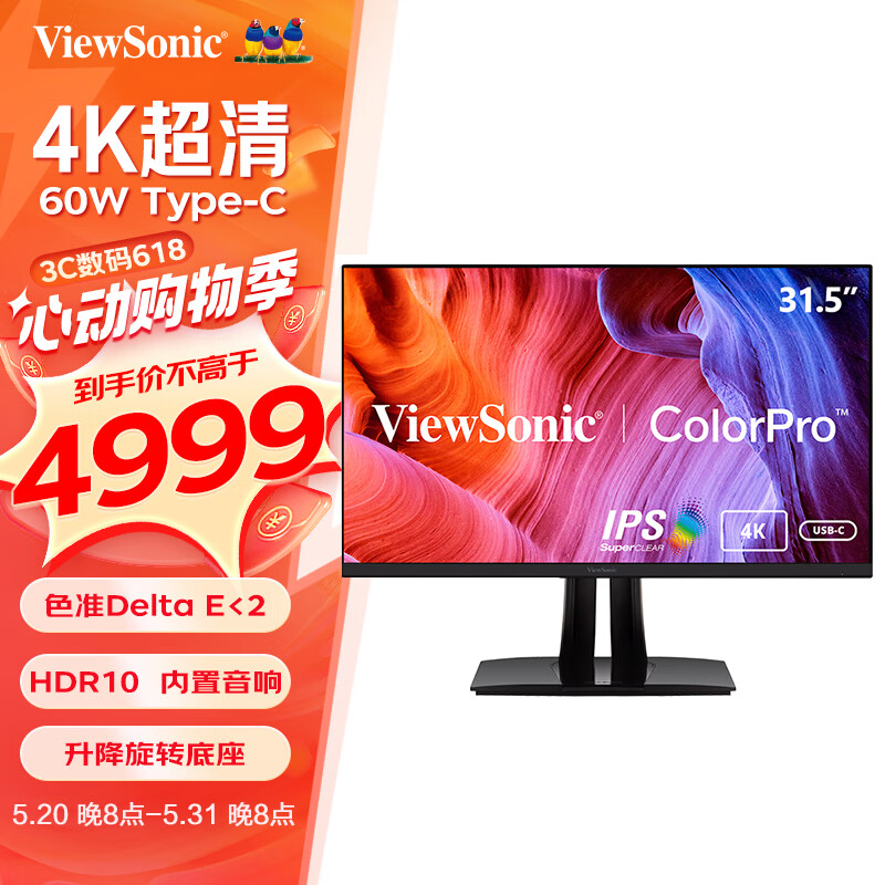 优派31.5英寸IPS设计显示器 4KHDR10Bit Type-C反向60W 10.7亿色音箱旋转升降摄影 VP3256-4K价格:4999.00元!