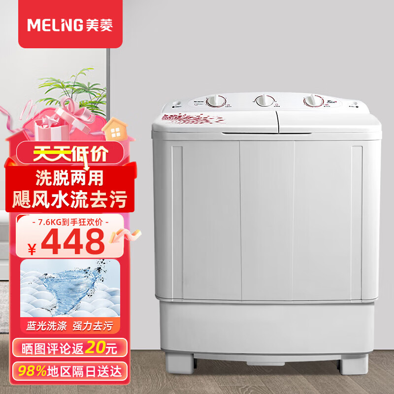美菱7.6KG半自动洗衣机双缸家用宿舍租房大容量双桶洗脱分离强力去污XPB76-22Q1S 白价格:508.00元!