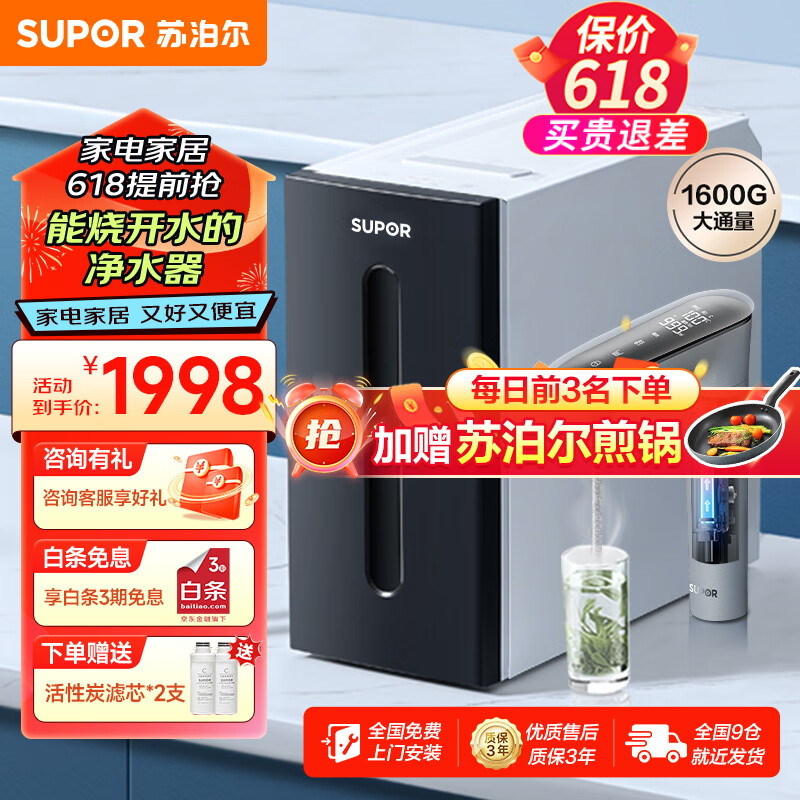 苏泊尔(SUPOR)净水器家用净热一体机RO反渗透纯水机过滤器UR2T1滤水器台上软水机厨下厨房1600G净水机4L/min价格:1998.00元!