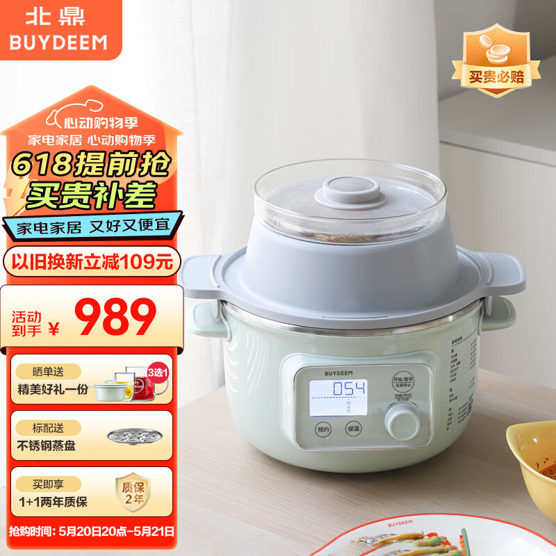北鼎(Buydeem)家用迷你电煮锅电火锅多功能全自动预约多用途锅【浅杉绿G37 含炖盅+陶瓷蒸蛋盘】价格:989.00元!
