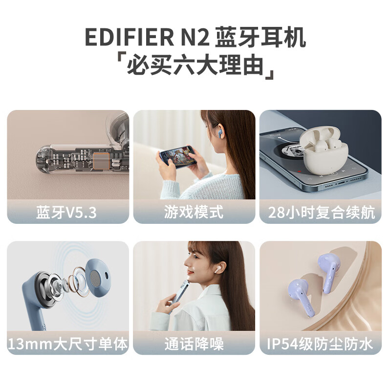 漫步者(EDIFIER)N2真无线蓝牙耳机 通话降噪 音乐耳机 蓝牙5.3 X2升级版 适用苹果华为小米手机 云岩白价格:168.00元!